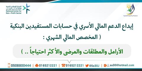 لجمعية تودع الدعم المالي الأسري في حسابات المستفيدين البنكية ( المخصص المالي الشهري :